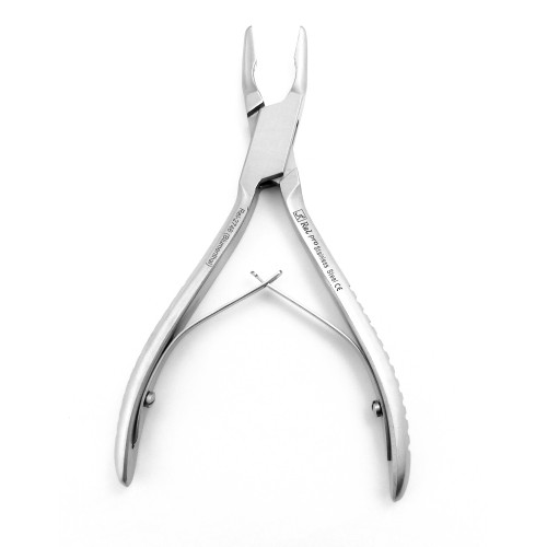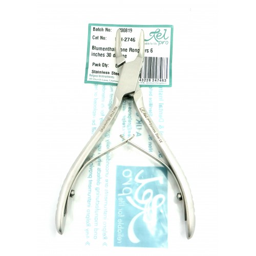 Relpro Instrument Blumenthal Rongeur is a double spring, plier instrument used in a variety of procedures to trim and remove bone. While large amounts of bone can be removed with rongeurs, pieces should be removed in small bites. Blumenthal rongeurs are available with three different angle tips, which allows them to be both side and end cutting and therefore useful in difficult to reach areas. They are often used in dental procedures to remove inter-radicular bone. This rongeur has tips angled at 30 degrees. The overall length is 6 inches.
